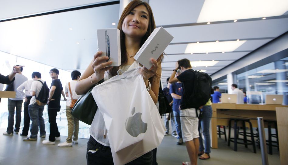 A customer shows her new iPhone 5 at the Apple store in Hong Kong Friday, Sept. 21, 2012. Apple’s Asian fans jammed the tech juggernaut’s shops in Australia, Hong Kong, Japan and Singapore to pick up the latest version of its iPhone. (AP Photo/Kin Cheung)